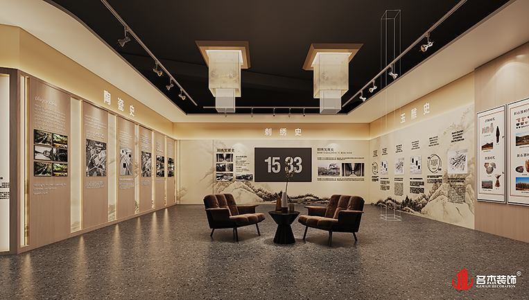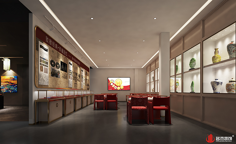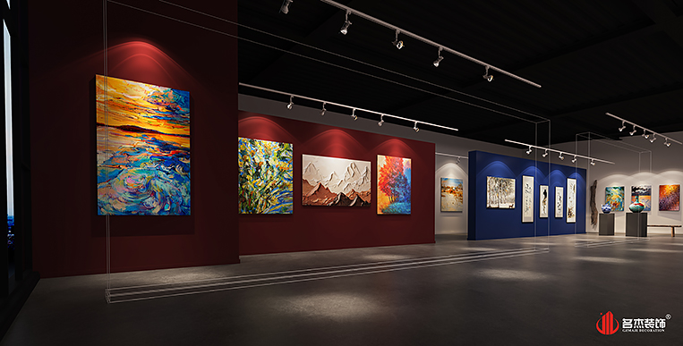 設(shè)計(jì)團(tuán)隊(duì)在前臺區(qū)域使用圓形吊頂,輔以具有線條美的燈具,配合中式傳統(tǒng)的配色來打造這個前臺區(qū)域,讓這個區(qū)域看起來帶有濃濃的新中式風(fēng)格。在展廳區(qū)域,則是使用仿燈籠造型的燈具,配合展廳的展品,來讓這個空間散發(fā)出更加濃郁的傳統(tǒng)氛圍。而在另一個展廳則是使用紅色和藍(lán)色,在視覺上形成一種強(qiáng)烈的沖擊感,讓空間看起來更加具有特色。#藝術(shù)館裝修設(shè)計(jì)#